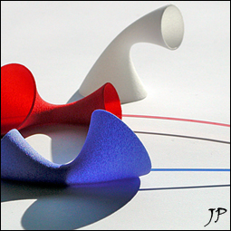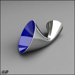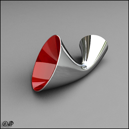 Uitvoering in gekleurd nylon, sterk en zeer licht draagbaar met snoertje en slotje in bijpassende kleur. Productie: rapid-prototyping. Het materiaal heeft het ijle karakter van perkament. Kleuren: rood-wit-blauw-zwart-paars-roze. € 90,-