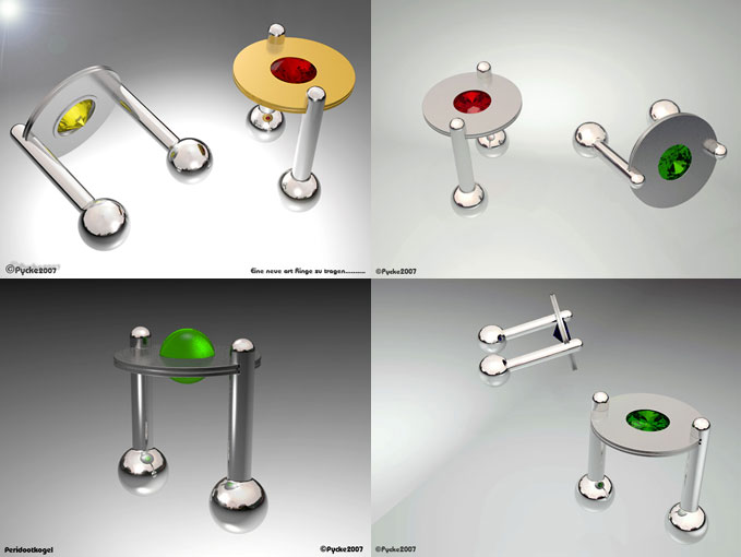 Pootjesringen: edelstaal met goud en geslepen stenen of kogels. Steendiameter: 10mm Steen aan de achterzijde gezet met een spanveer in een groef. Vanwege de goede pasvorm worden de ringen geleverd oplopend met halve maten; 15.5-16-16.5 enz.