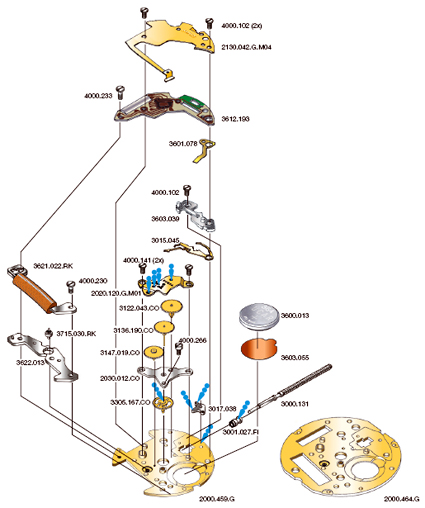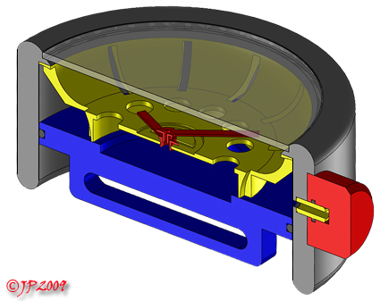 Specs: kast Ø 41x17.5mm. uurwerk 8¾''', opgesloten onder de uit één stuk gefreesde wijzerplaat. Wanneer de horlogeband alleen door de middelste groef wordt gehaald kan de stop echt uit het bad getrokken om toegang te krijgen tot het uurwerk.