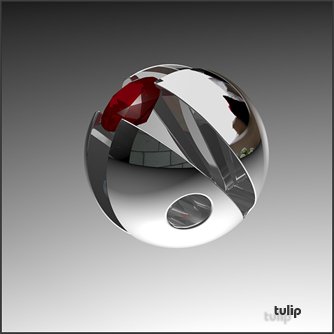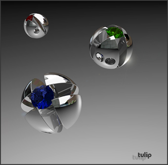 Met schuine groef. Geopend als een bloemknop, uitgevoerd in staal, gerhodineerd zilver met synthetische stenen en 18 karaat goud met diamant, peridoot, robijn en saffier.