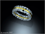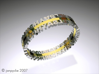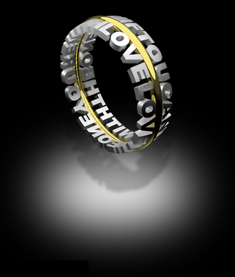 Gespiegelde tekst gesatineerd , in het midden een hoogglans geelgoudbaan. Het voorbeeld telt 2 x 36 karakters. Totale breedte : 4mm, hoogte: 1.5mm. Afbeelding: ringmaat 19. Tekst al of niet gespiegeld naar keuze. Uitvoerbaar in één kleur of in bi-color naar keuze, rood-wit, geel-wit, rood-geel enz.