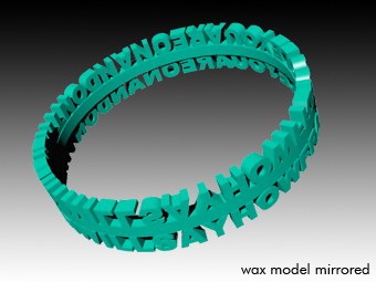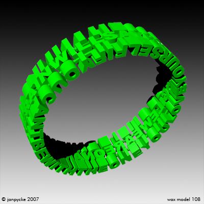 Wasmodel; 108 karakters en twee steegjes die de tekst verbinden. Breedte: 6mm, dikte: 2mm. Afbeelding vergroot tot 300%. Werkelijke ringmaat: (binnendiameter) 20mm. Tekstblokjes 2x2x2mm. Uitvoering: alle edelmetalen.